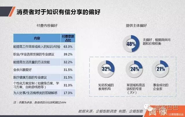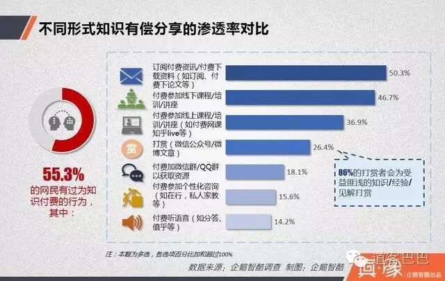 知识分享经济本质是什么? 随着越来越多的知识分享平台的出现,有道客巴巴这样付费知识文档交易,有在行、问咖等专家约谈知识交易,还有如值乎类似的付费阅读交易。如果不加以区分,很容易让人搞混三者的区别。所有首先要对知识分享经济做一个概念化的分类,它隶属于知识经济下的知识服务经济。 从目前来看,知识经济主要可分为两大类: 第一类,知识产品:书籍、培训、艺术品等。是指依靠知识而产生出的成果,经过某些转化、加工、生产后才能将知识固化于某种载体上,如纸张、视频、音频等。 第二类,知识服务:是指从各种显性和隐性知识资源中按照人们的需要有针对性地提炼知识,并用来解决用户问题的高级阶段的信息服务过程。这种服务其特点就在于,它是一种面向知识内容和解决方案的服务,而目前知识分享平台都可归为知识服务的类别。 在《报告》中显示,近八成人经常或者有时会有对于想获取的知识/资源无从入手的情况。超过五成网民有过不同形式的为知识付费的行为,渗透率最高的是订阅付费咨询和付费下载资料(50.3%);从消费者的付费内容偏好来看,“能提高工作效率或收入的知识和经验”最被认可,有63.3%的人有意愿付费。 可见,知识分享经济的本质是在信息不对称的当下,部分人有意愿通过付费,向某领域权威人士或专家购买所需知识,不过问题是知识作为产品不好定价,大约有25%的网友认为如此。 现代知识分享经济特点 以现在火爆的知识分享经济而言,应该具备以下三个要素: 1、具备基于互联网的时代特性;互联网(包含移动互联网)改变了人类信息传播形态、模式和广度,正是因为互联网的存在,让知识分享可以脱离空间的限制,在互联网之前知识分享需要人与人直面沟通,如今可以通过直播、面谈、语聊、互联网文本等多种形式,让知识分享真正实现大众化。 2、归类知识服务;无论在行、分答、值乎还是道客巴巴的任务平台,只有归类为知识服务,而不是知识产品的转移,属于信息的更高形态的传播才可归类为知识分享经济。 3、具备普适性;知识分享经济是共享经济的一个分支,共享经济是人们公平享有社会资源,各自以不同的方式付出和受益,共同获得经济红利。此种共享更多的是通过互联网作为媒介来实现的。知识分享经济要具备普适性,产生规模效益。 知识分享平台三大主流模式 隐形知识模式:分答、在行及其他知识分享平台为代表,用户提需求,专家通过面谈、电话交谈、语音模式向需求者提供服务,用户向专家付费。该模式浅度交流为主,需求者选定所需知识领域的专家并付费提问,知识提供者根据需求者的提问回答。这种隐形模式多以知识提供的方的过往经验、知识沉淀、价值观所产出的非创作型、非结构化、非文本化的内容。 其优点是,为用户提供同各领域专家直接接触的通道,比如王思聪分答上的回答,此前一个陌生人是很难提问他并得到回复的。其缺点,此类模式是非标性,其商业依据不是结果导向,而是根据知识提供方自身价值的一种评估,以时长或次数收费。因为难以衡量,专家无知识有效义务,用户却要为自己的提问付费,缺乏平等关系的知识分享,其价值衡量上是十分困难。 显性知识模式:道客巴巴任务平台悬赏解决需求,类似于猪八戒,区别的是猪八戒提供的是产品,而道客巴巴强调的是知识服务。在这些平台上,需求者提出明确的需求,例如在道客巴巴任务平台上,寻求知识提供者分析自己程序BUG原因所在、生活上某些困惑的解答、职场上具体问题解决经验等。 其优点是它以文档为核心的知识分享模式,是一种从连接人与信息向连接人与服务转换的平台。让更专业的人来做专业的事情,是传统文档服务的产业链条的细分。缺点,平台要考虑供需两方利益,增加了知识提供者劳动收入失衡风险,如何制定一套规则,解决供需双方有可能的纠纷是未来需要优先考虑的问题。 兴趣知识模式:以值乎为代表,收费阅读,类似网络文学收费阅读,是趣味知识类型知识分享,兴趣同实用一样是驱动人获取知识两大动力原因之一。值乎于2016年4月由知乎推出,用户关注知乎公众号后可以在微信朋友圈里分享自己的打码信息,而其他人必须付费才能看到,付费后觉得满意钱就归作者,不满意钱就归知乎官方。该类知识分享平台主要以兴趣推动,用户只对有兴趣的内容进行付费。 优势是趣味阅读是人天性,覆盖面很广。缺点有局限性,该类型最大的特点是用户是被动接受知识,只有对感兴趣的内容才会付费,该模式会让知识分享走入标题党等娱乐化的误区。另外被动型造成兴趣知识交易马太效应会很严重,拥有粉丝的专家或达人更易成为最大受益者。 三种模式各有千秋,未来会以其不同的属性发展壮大,至于粉丝知识交易、实用知识交易还是兴趣知识交易谁会成为未来知识分享经济的主流,这要看哪个模式用户群更大,三者都拥有很大的发展潜力。 知识分享经济成为新兴产业要解决的三大问题 商业的目的是盈利,消费的动力是获取所需。虽然当下知识分享经济唱热、唱衰者旗鼓相当,从《报告》里我们能看到,“提高工作效率或收入的知识/经验”占比最高,也就是说期待知识分享经济解决刚需的为整个人群的大头。此外,《报告》里显示已有知识分享消费的用户里将近49.7%表示一般,仅有38%表示体验满意的比例,可见知识分享服
